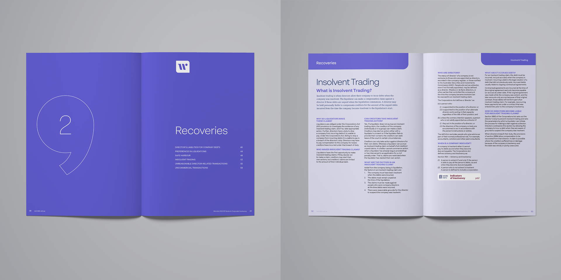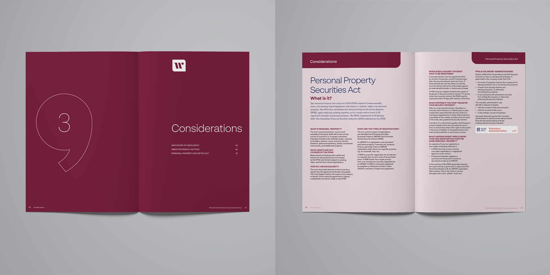 The Worrells Guide to Insolvency is refreshed with new brand, content and visual approach for the 2022/23 edition. 84 pages of graphic communication packed with visual tabs, clear typographic hierarchy, interactively linked dynamic references and repeatable elements. What could be information overload has been shifted into an easily and clearly accessed guide.
